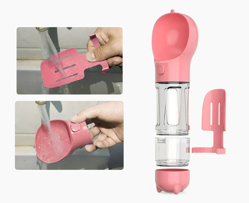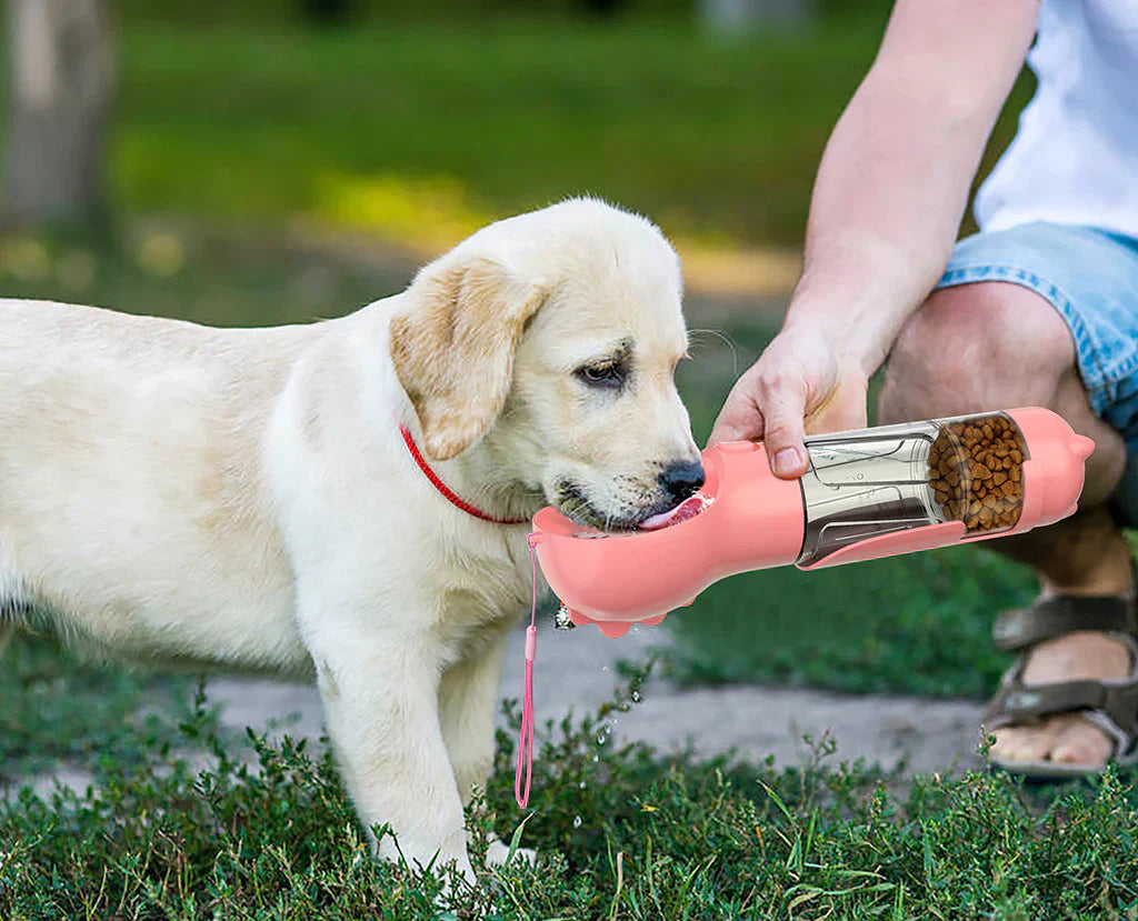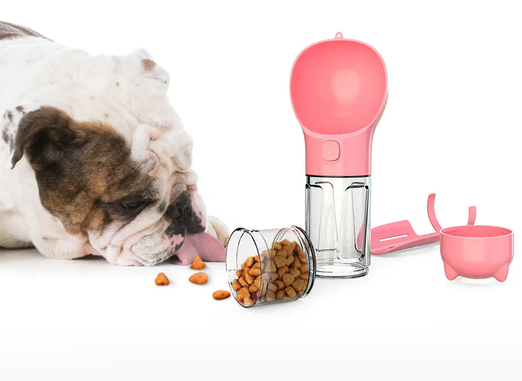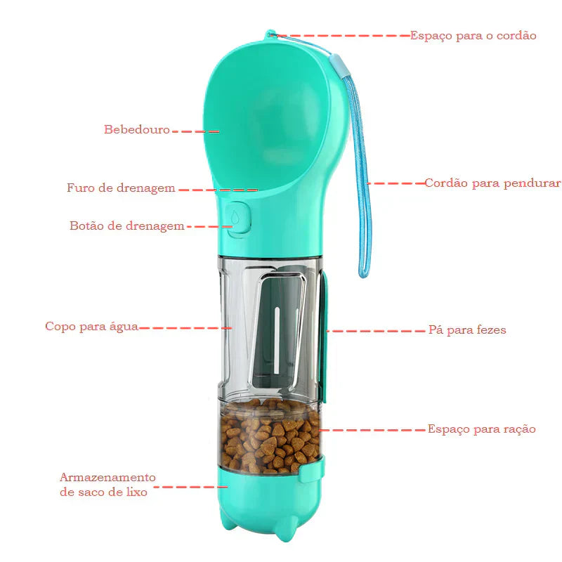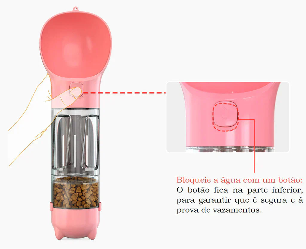 Facilite os passeios com seu pet! Adquira agora a Garrafa Portátil - 3 em 1 e mantenha seu companheiro hidratado e alimentado durante todas as aventuras!